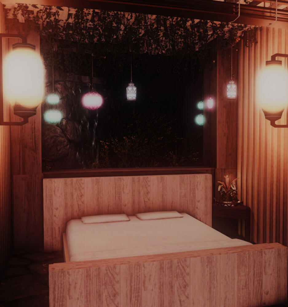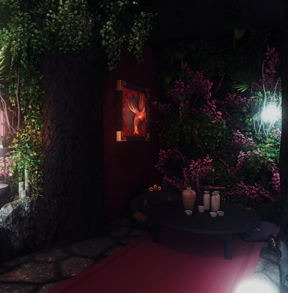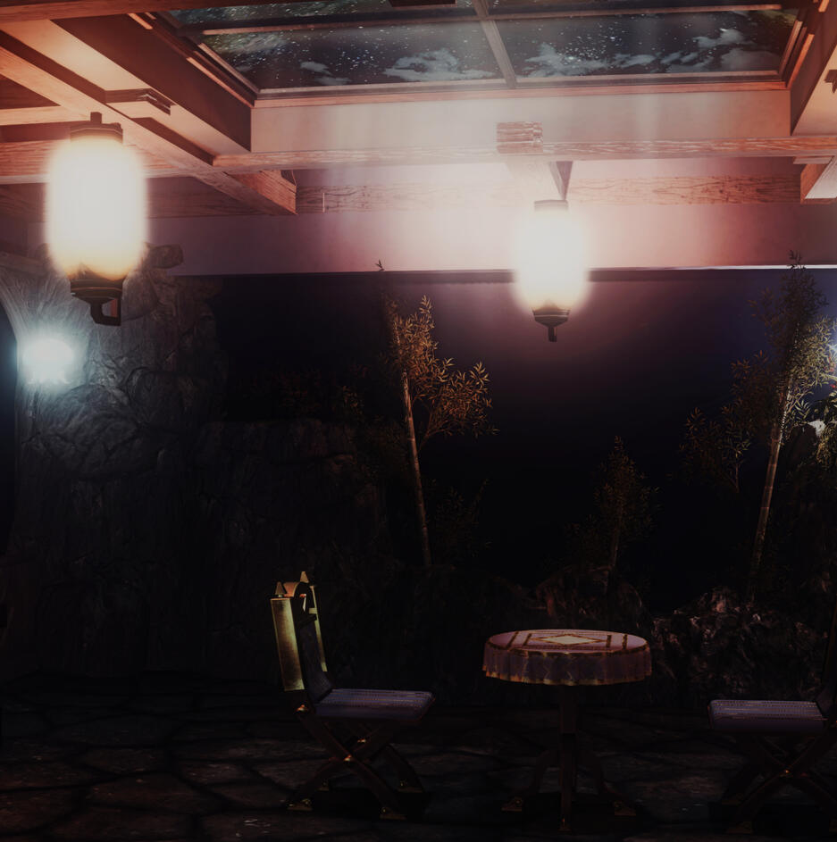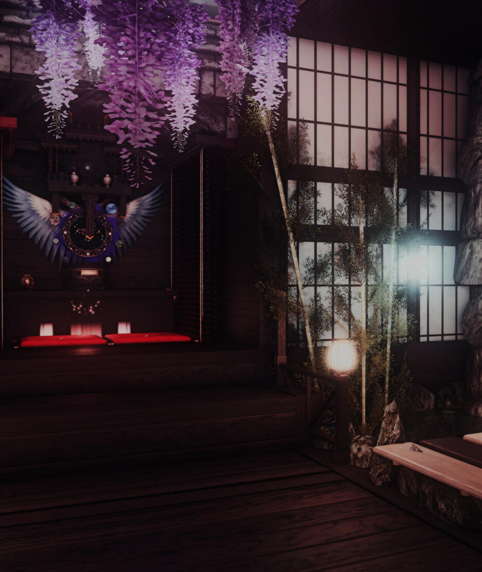 The Midnight Torii lies where moonlight meets shadow. A secluded shrine reborn as a sanctuary of glass and silence, veiled by whispering bamboo and drifting incense. Guests are welcomed by the soft toll of bells and the faint shimmer of aether in the air, encouraged to set aside their masks and surrender to the hush beneath the lanterns’ glow.