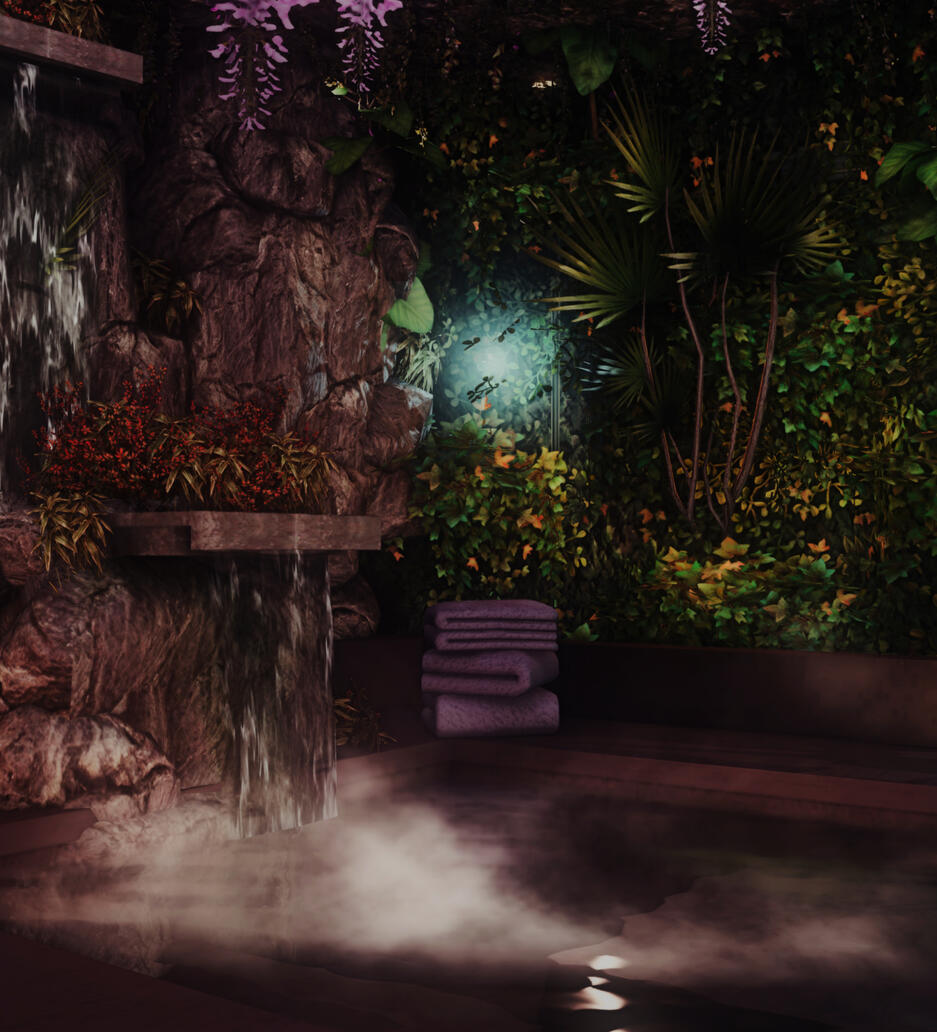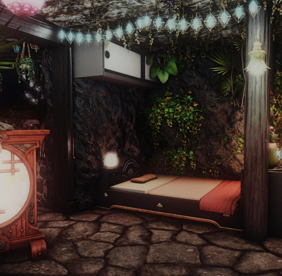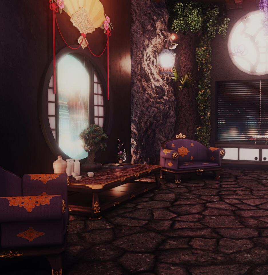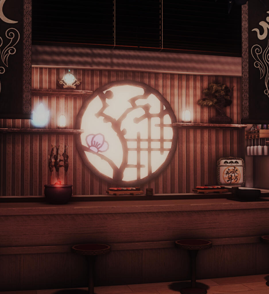 The Midnight Torii lies where moonlight meets shadow. A secluded shrine reborn as a sanctuary of glass and silence, veiled by whispering bamboo and drifting incense. Guests are welcomed by the soft toll of bells and the faint shimmer of aether in the air, encouraged to set aside their masks and surrender to the hush beneath the lanterns’ glow.